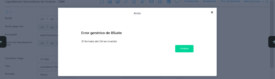 Al anular una Liquidación Secundaria de Granos con un contradocumento, el sistema emite el siguiente mensaje de error: