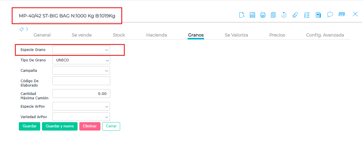 Descripción: Si el producto no está relacionado con una especie de grano, selecciona la especie correspondiente y guarda los cambios.