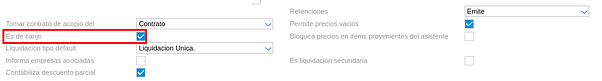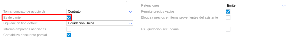 En el documento de categoría Liquidación de Compra de Granos se debe tener activado el check “Es de canje”: