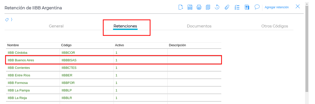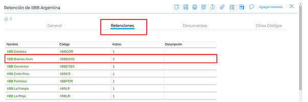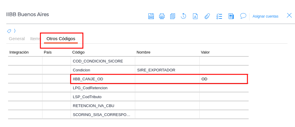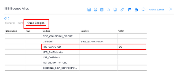 Dentro del maestro de Tipos de Retención, en cada concepto de retención, dentro de la solapa de Otros Códigos debe figurar el código IIBB_CANJE_OD con el valor OD:
