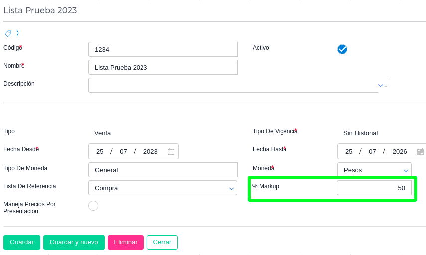 - Completar todos los campos necesarios y agregar un porcentaje en el campo % Markup