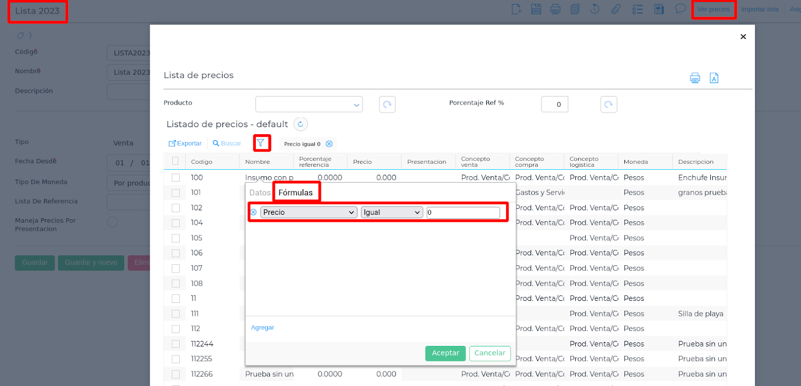 - Seleccionar “Ver precios” dentro de la lista de precios.