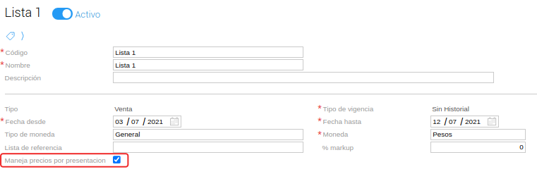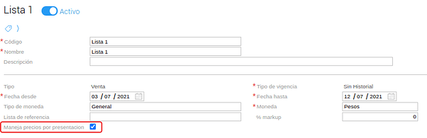 - Si se decide cambiar la configuración y destildar el check se volverán a mostrar, en caso de que hayan estado configurados antes, los precios que tenía la lista por producto sin presentación. Es decir, quedan guardados los datos de los precios configurados con y sin el check, y luego depende si se lo active o no muestra uno u otro.