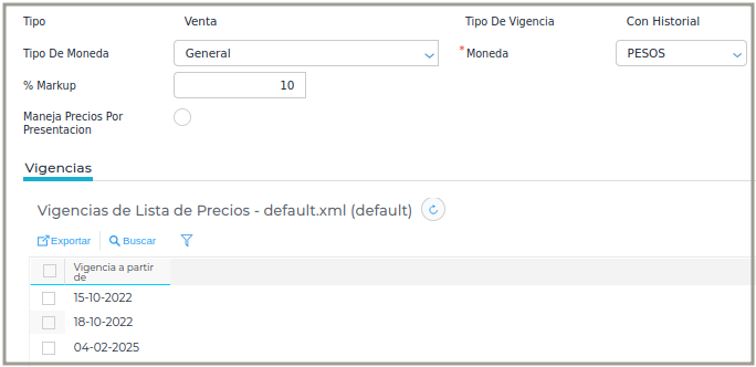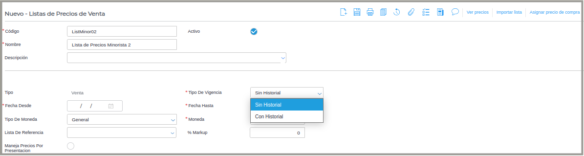 - Sin historial, la lista de precio tomará la fecha desde y hasta como únicas vigencias.