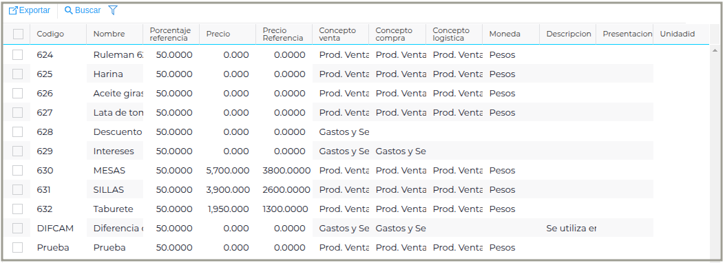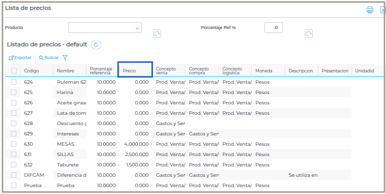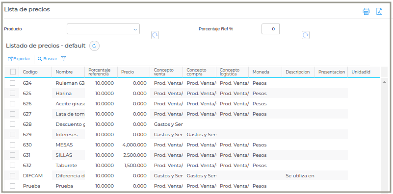 Una vez que se haya seleccionado lo que se desea filtrar, se va al botón refrescar y se va a ver la lista de precios. El contenido de la lista depende según el tipo que se le haya asignado a la lista (ver más arriba, definición de Tipo).