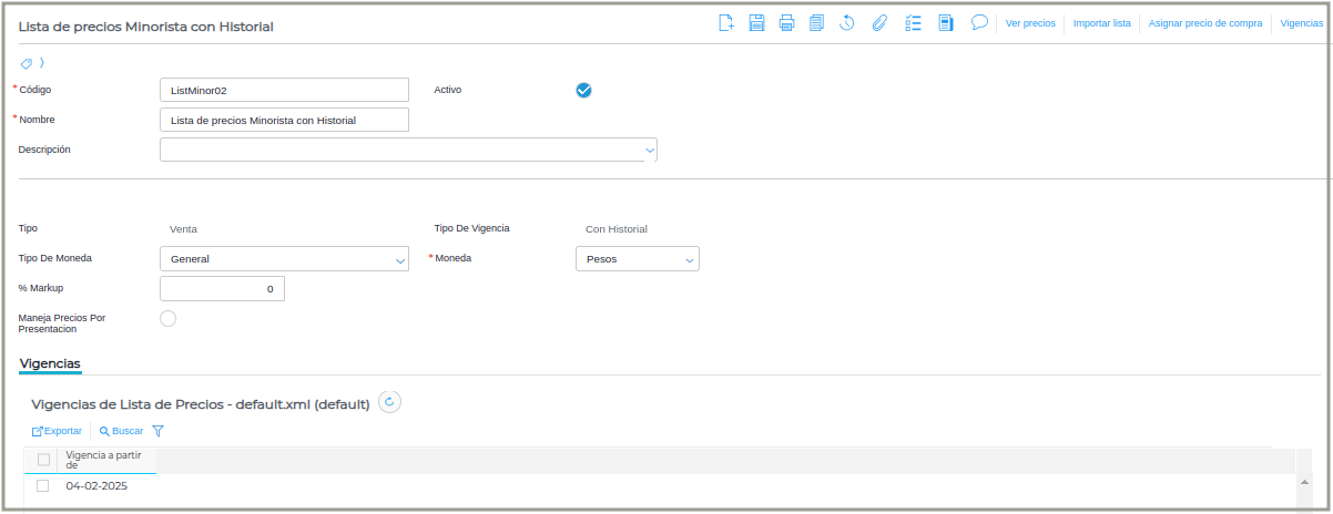 NOTA: luego de guardar la lista de precios, NO será posible modificar el tipo de vigencia.