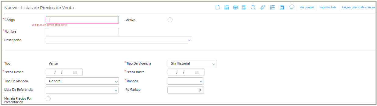 Proveedor: sólo es visible cuando la lista es de tipo Compra, y es obligatorio. Si la lista es de tipo Venta, este campo no es visible.