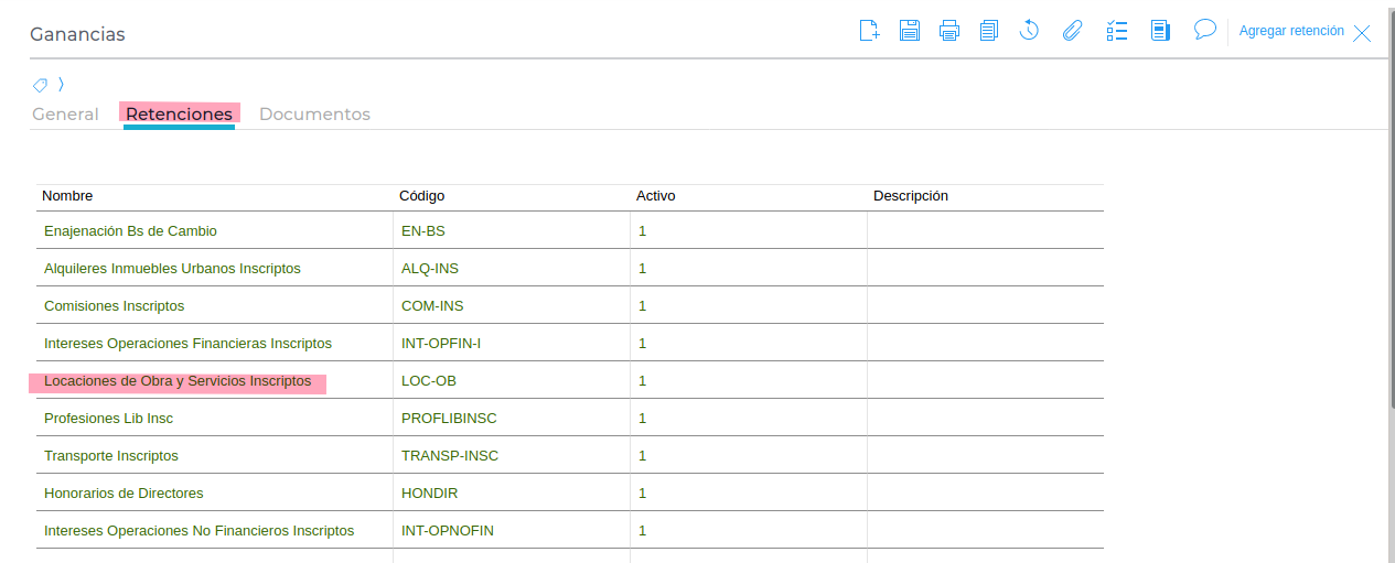 Ruta: Gestión Empresarial - Impuestos - Maestros - Tipos de Retenciones.