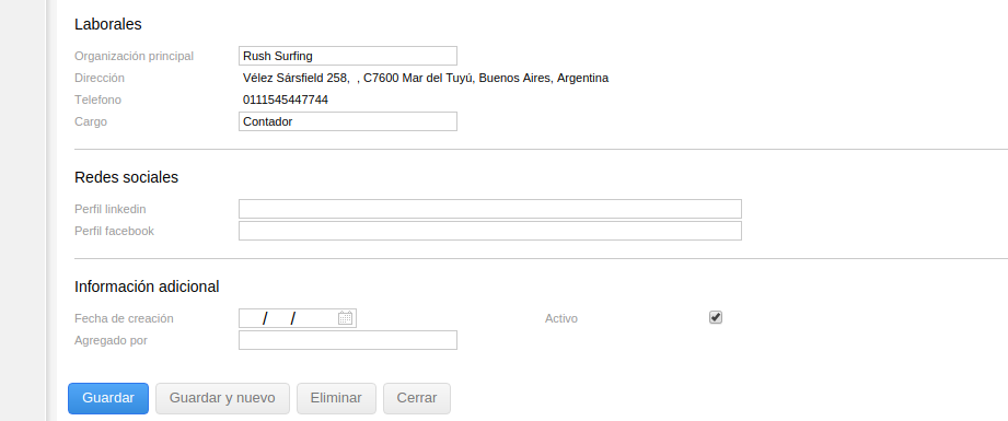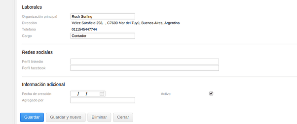 - Activo: indica si el contacto creado se encuentra o no disponible para su utilización.