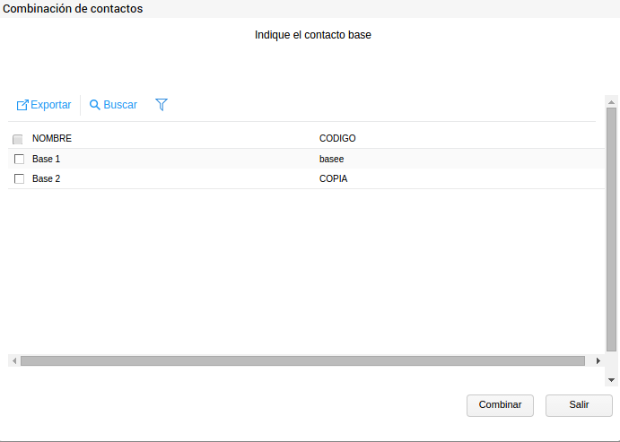 Al presionar Combinar Contactos se muestra una ventana como la siguiente, donde se debe escoger el contacto que será Base.