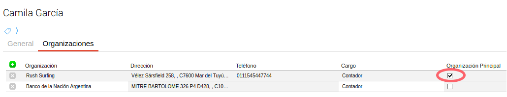 - Organización principal: permite seleccionar una organización para el contacto creado. De esta manera se puede hacer una relación entre el contacto y la empresa a la que pertenece. Al completar este campo, el sistema muestra en la solapa Organizaciones todos los datos de esa organización como dirección, teléfono y cargo sin edición, indicando con un check que ésa es la principal.