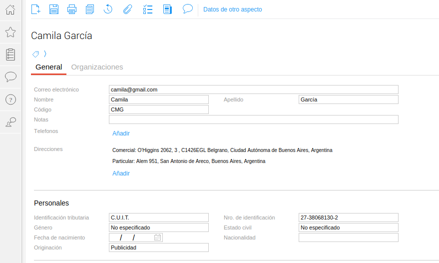 En esta solapa se pueden indicar todas las organizaciones a las que pertenece el contacto.