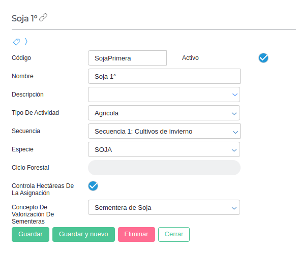 Concepto de valorización de sementeras: permite definir un concepto de valorización de sementeras default para la actividad. Al asignar actividades a establecimientos se autocompleta este valor.