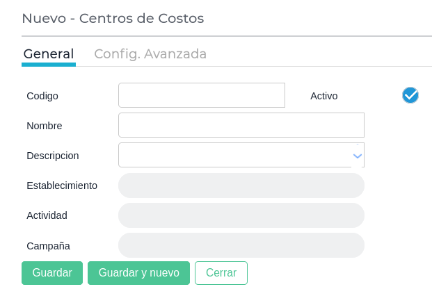 - Activo: Indica si el centro de costo se encuentra o no disponible para su utilización en transacciones e informes.