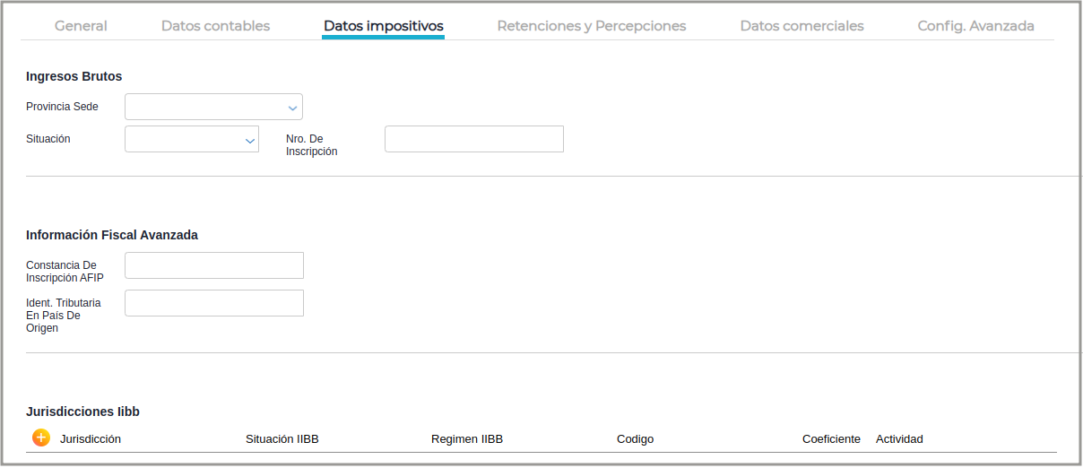 En esta solapa se permite indicar la o las jurisdicciones donde tributa el tercero y establecer su situación respecto al impuesto a los Ingresos Brutos. Se pueden agregar tantas jurisdicciones como sean necesarias.