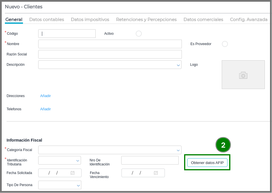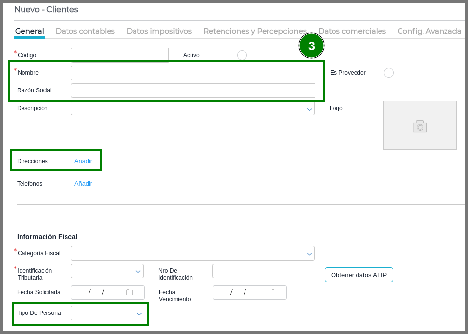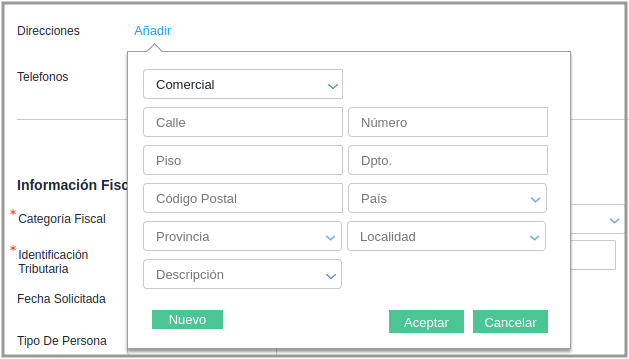 Tipo: identifica el tipo de dirección creada. Los valores posibles son: Comercial, Fiscal, Legal, Particular, Otro y Entrega. La dirección de tipo Fiscal es utilizada en todos aquellos reportes o procesos impositivos que requieran que se informe la dirección fiscal del cliente. En caso de haberse definido más de una dirección fiscal, el sistema utilizará la primera que se haya creado.