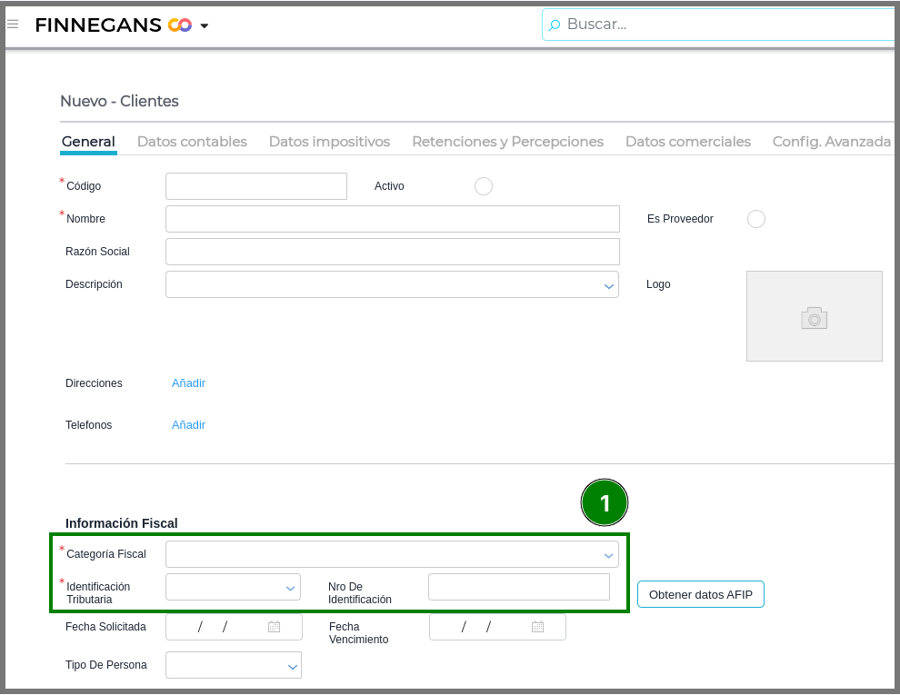Identificación Tributaria: indica el tipo de identificación impositiva del cliente (CUIT, CUIL, RUT, DNI, etc.) Sólo se pueden seleccionar registros previamente definidos en Identificación Tributaria.