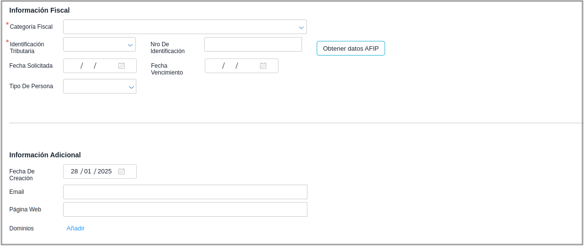 Ingresando la identificación tributaria con su respectivo número de identificación y presionando sobre “Obtener datos AFIP”, se completan las casillas de nombre, razón social, direcciones y tipo persona.