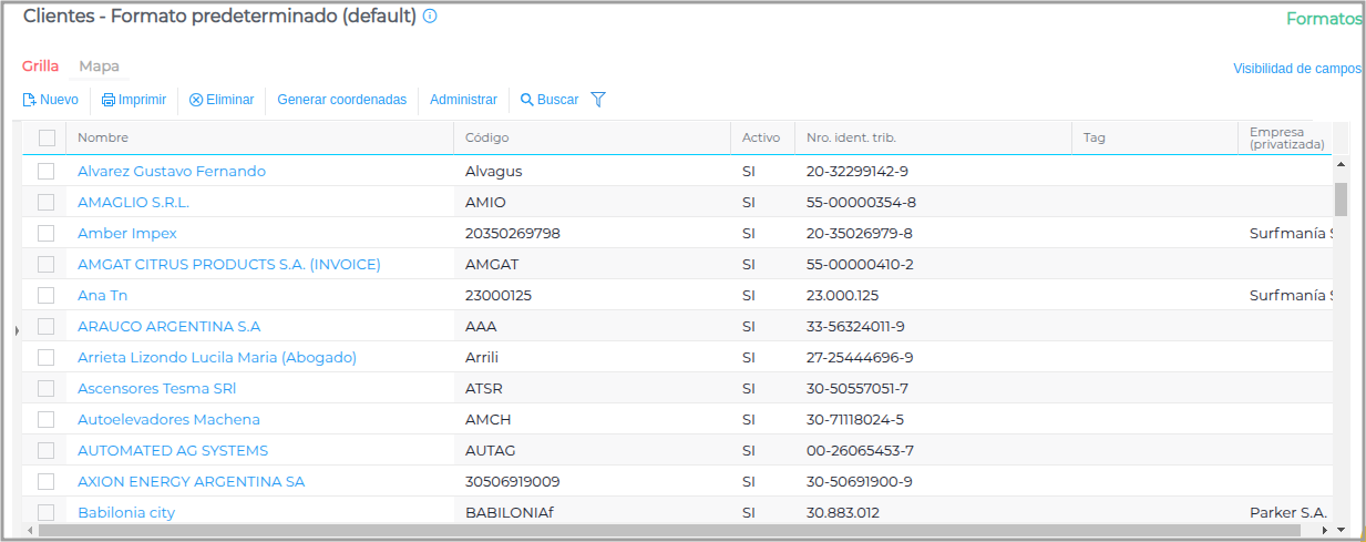 Al ingresar, el sistema presenta la lista de los mismos. Desde aquí es posible agregar nuevos clientes, editar o eliminar los existentes.