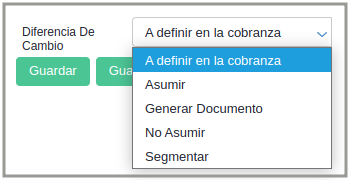 Completar el campo “Diferencia de cambio” permite seleccionar las mismas opciones que en el asistente de la cobranza, y además la opción A definir en la cobranza.
