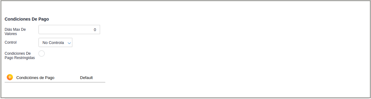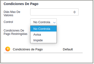 Condiciones de pago restringidas: cuando el check box está activo, el selector de Condiciones de Pago en las transacciones, permite elegir sólo entre las condiciones indicadas en el Cliente/Proveedor. Cuando no está activo, el selector trae todas las condiciones de pago.