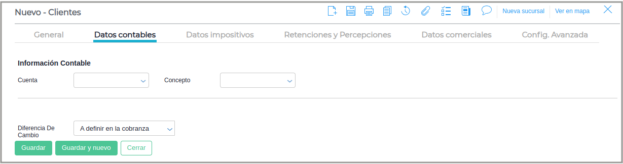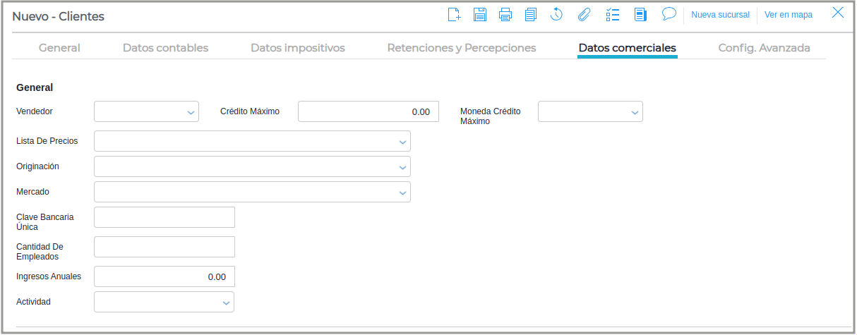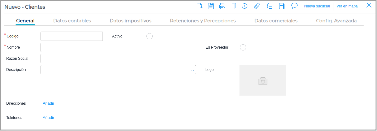 Desde Nueva Sucursal se ingresan las sucursales que el cliente posea.