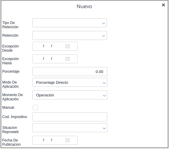 Porcentaje: representa el porcentaje de excepción a aplicar sobre la retención efectuada. La forma en que se aplique depende del modo de excepción seleccionado.