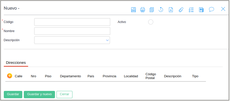 Localidad: identificación de la localidad correspondiente a la dirección creada. Sólo se pueden seleccionar localidades que hayan sido previamente creadas en “Localidades”.