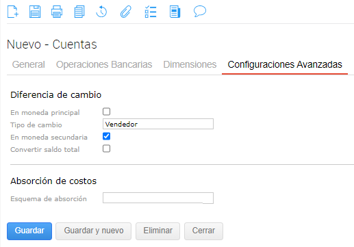 Moneda única: este campo no es obligatorio. Se utiliza sólo para aquellas ocasiones en las que se desea restringir el uso de una cuenta para una única moneda. De tener un valor ingresado, no se permite su uso en ninguna transacción que utilice una moneda distinta.