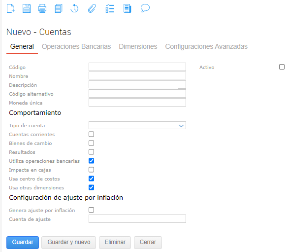 Activo: indica si la cuenta creada se encuentra o no disponible para su utilización en nuevas transacciones. Si un registro se encuentra inactivo, el mismo no se puede utilizar dentro de la transacción correspondiente, pero sigue disponible para su consulta en los distintos reportes del sistema en donde intervenga.