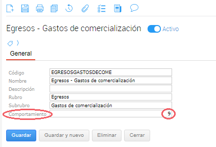 Elegimos alguna de las categorías, para este ejemplo elegimos la categoría Egresos - Gastos de comercialización. En el campo Comportamiento le configuramos el valor 9, valor que tomamos de la planilla de comportamientos adjuntada.