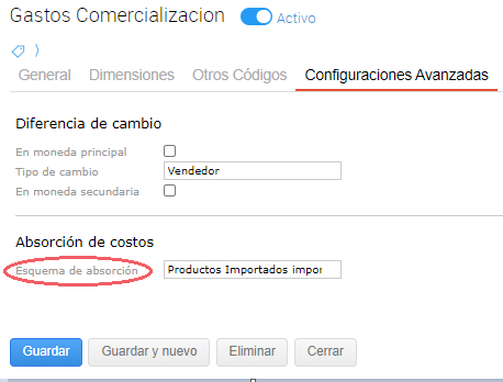 Esquema de Absorción: permite asociar un esquema de absorción de costos a la cuenta, para luego incluir el importe en el prorrateo a realizar en la transacción Absorción de costos.
