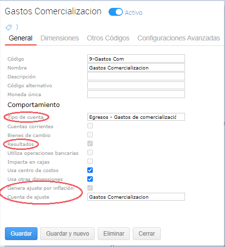 Genera Ajuste por Inflación: Al activar este check se indica que la cuenta será ajustada por inflación en el respectivo proceso. Este check está activo por defecto para todas aquellas cuentas categorizadas como de Resultados (Ingresos o Egresos).