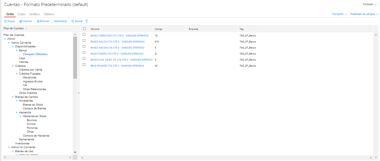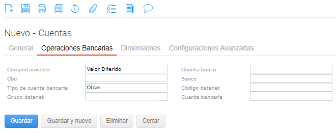 Comportamiento: indica si la cuenta contable representa una cuenta bancaria o si manipula cheques y valores diferidos. En el caso de definir Valor Diferido al momento de imputar la transacción se solicitan los datos correspondientes al valor diferido involucrado. En caso de definir “Banco”, requerirá otros datos.