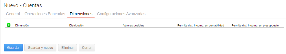 Usa centro de costos: Al activar este check se habilita la solapa DImensiones y al guardar la cuenta se configurará por default la dimensión Centros de costo. Cuando se está configurando la cuenta se puede hacer el ingreso manual de este dato.