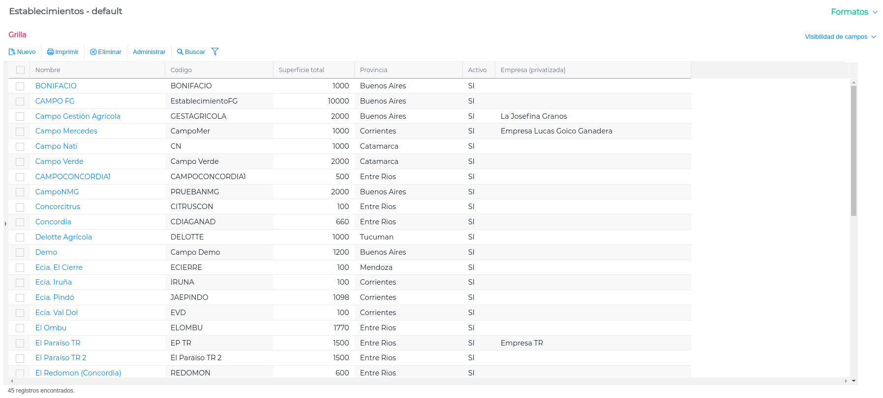 Los Establecimientos representan una configuración esencial para una adecuada y correcta gestión agropecuaria. En ellos se especifican las actividades que formarán parte de las planificaciones agrícolas y ganaderas. Es importante tener definida la cantidad de hectáreas que forman tanto el establecimiento como así los lotes del mismo.