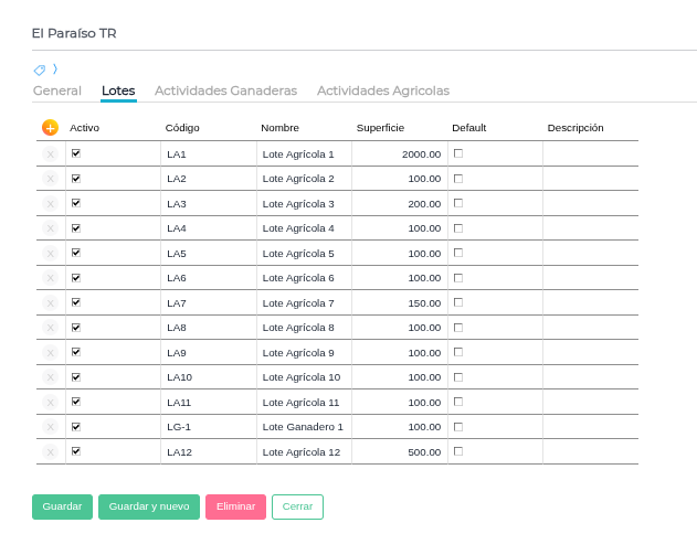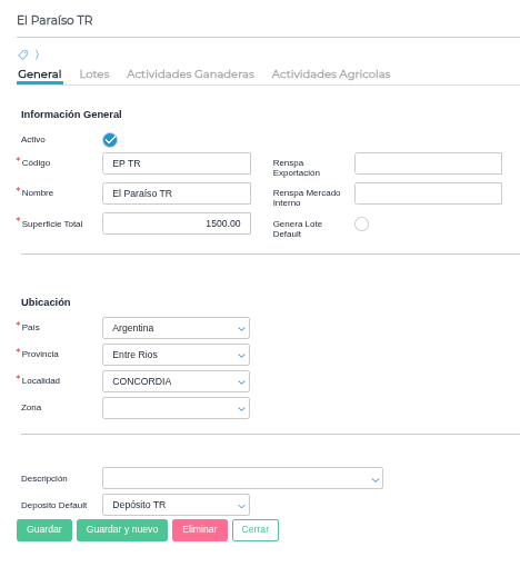 - Genera Lote Default: Al activar este check y guardar el Establecimiento se genera un Lote Default por el total de la superficie del Establecimiento con el mismo nombre del establecimiento.