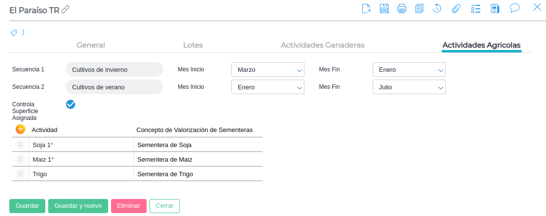Controla Superficie Asignada: Al tildar este check el sistema controlará que no se asigne una superficie mayor a la configurada en el lote, es decir, no se podrán registrar planificaciones por una superficie mayor a la del lote.