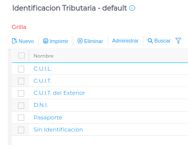 - Al ingresar a la ruta indicada, se observarán las identificaciones tributarias que el sistema posee por default: