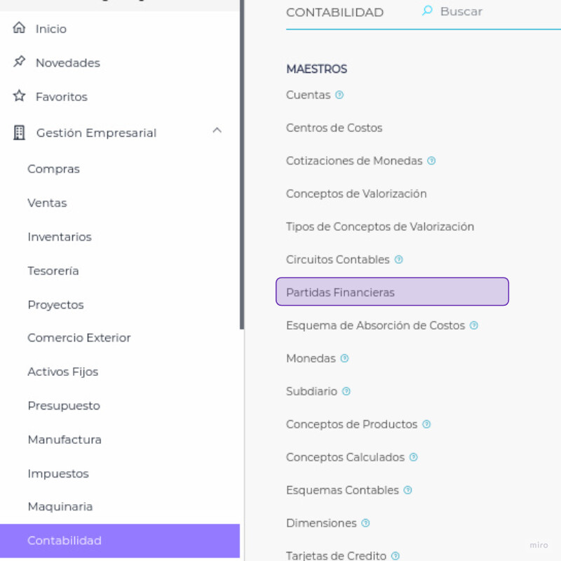 - Ingresar al Menú - Gestión Empresarial - Contabilidad - Maestro: Partidas financieras.