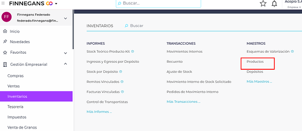 Menú Desplegable → Gestión Empresarial → Inventarios → Productos