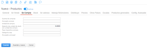 Se compra: al tildar este check habilita la solapa Se compra para realizar las configuraciones necesarias para compras. Cuando se da de alta un producto nuevo, este check está sin tildar.