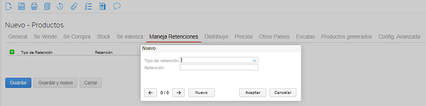 Maneja retenciones: al tildar este check habilita la solapa Maneja retenciones para realizar las configuraciones necesarias de las retenciones. Cuando se da de alta un producto nuevo, este check está sin tildar.