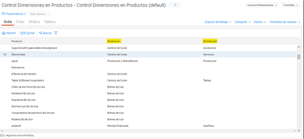 Esta solapa permite visualizar la dimensión asociada al producto y su distribución por defecto, en el caso que la dimensión tenga más de una distribución.