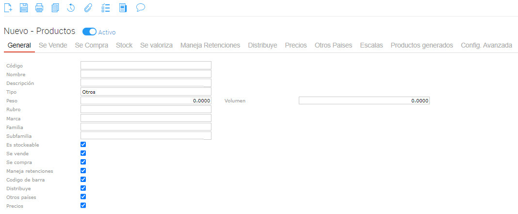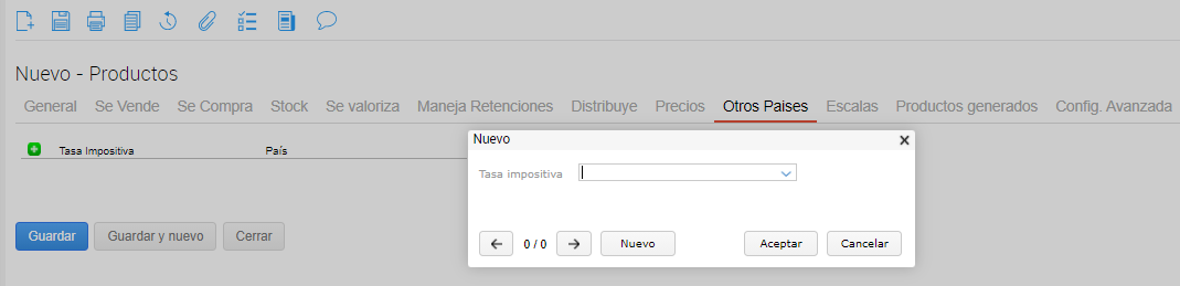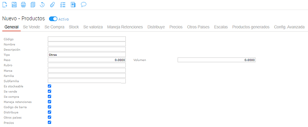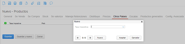 Otros países: al tildar este check habilita la solapa Otros países para realizar las configuraciones necesarias de otros países. Cuando se da de alta un producto nuevo, este check está sin tildar.
