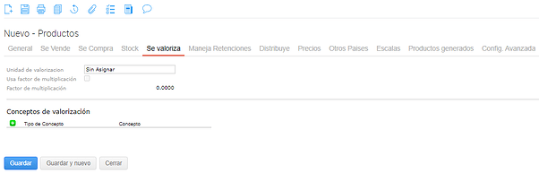 Tipo de Concepto: indica el tipo de concepto de valorización a utilizar para el producto en el proceso de valorización de stock. Para mayor información acerca del uso y configuración de los mismos, referirse a “Tipos de Conceptos de Valorización”.