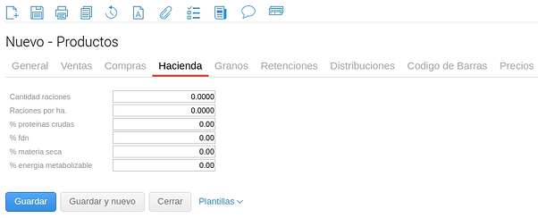 En esta solapa se editan las características de productos que se utilizan para suplementar la hacienda, y solamente tienen sentido para aquellos productos de Tipo Raciones Forrajeras.
