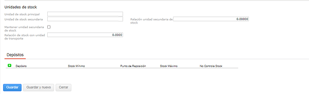 El sistema permite identificar cuál va a ser el stock mínimo y el punto de reposición del producto creado, para cada uno de los depósitos que la empresa posee, y también permite indicar si para cada depósito se debe controlar el stock del producto o no. Esta información no es obligatoria, pero de estar informado permite obtener y analizar desvíos contra estas cantidades en el reporte de Resumen de Stock.