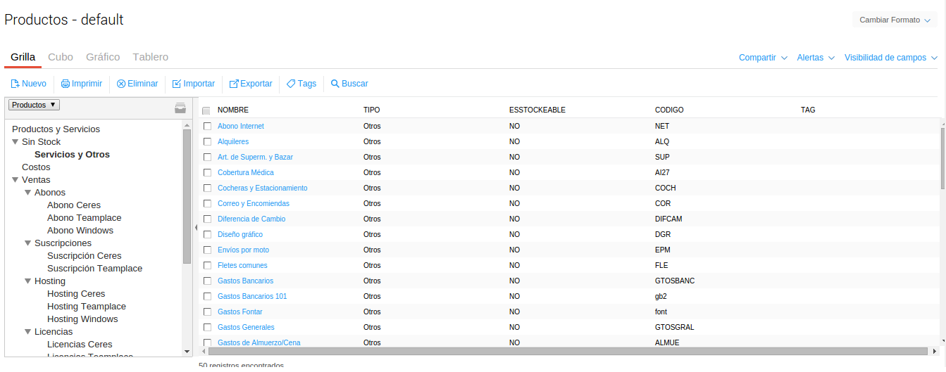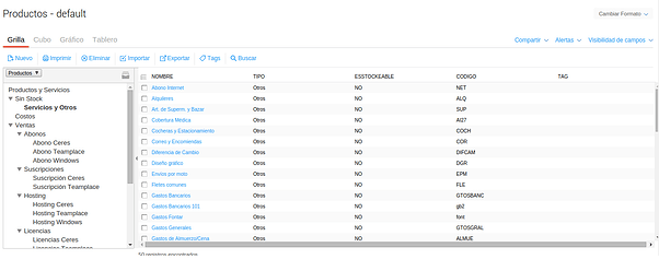 Cada uno de los productos posee una configuración y datos contables acordes con las operaciones, como compras, ventas, stock, etc.