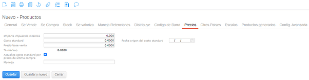 Precios: al tildar este check habilita la solapa Precios para realizar las configuraciones necesarias relacionadas con el precio. Cuando se da de alta un producto nuevo, este check está sin tildar.